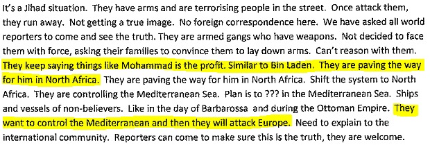 In an 11:15 a.m. phone call, Gadaffi told Blair: “They [jihadists] want to control the Mediterranean and then they will attack Europe.”