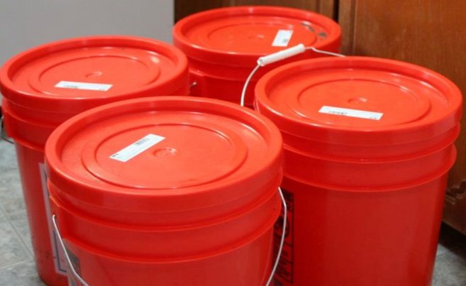 First things first – you’ll need enough 5-gallon buckets for everyone in your family; everyone has their own kit. You can buy these at home improvement stores, hardware stores, paint stores and so forth. You can also pick them up at the big box retailers.