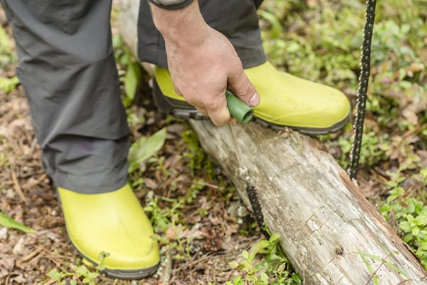 If you’re not sure how to use a pocket chainsaw, take some wood or whatever it is you want to cut, then secure it to the ground with your foot. Stand parallel to the log.