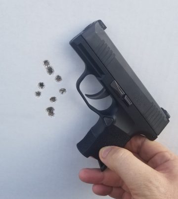 But even more to my astonishment, when I test fired the Sig P365 right out of the case, with zero modifications, I was able to put 10 rounds into a 3″ circle from 20 feet away, using the stock trigger and stock sights. The following photo is my own, showing my pistol, my hand and the 10 rounds on paper, from 20 feet away. (This was not a cherry-picked photo, either. I literally loaded the new pistol, shot these 10 rounds and took the photo. There wasn’t a single stray round.) By the way, if you only count 9 rounds here, there are actually two bullet holes nearly on top of each other, second from the top. It’s actually all 10 rounds. Remember, too, this is from 20 feet away: