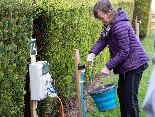 - Wash – Fill a quarter of a collapsible bucket with warm water. Add eco-friendly soap. Start from cleanest to dirtiest. Once the dishes are clean, shake off excess suds.