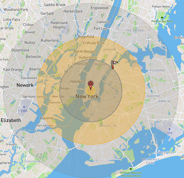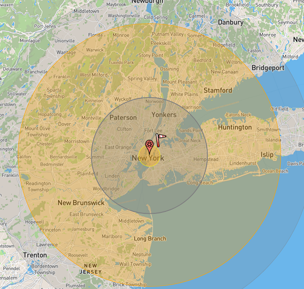 If you increase the nuclear yield to 100 megatons — well within the capability of Russia’s largest nuclear ICBMs — you get a fireball that extends nearly to Trenton, NJ while engulfing Stamford as well as about half of Long Island. Casualties would number over 8 million instantly, with another 6.7 million injured. The radius of this fireball is 6.1km: